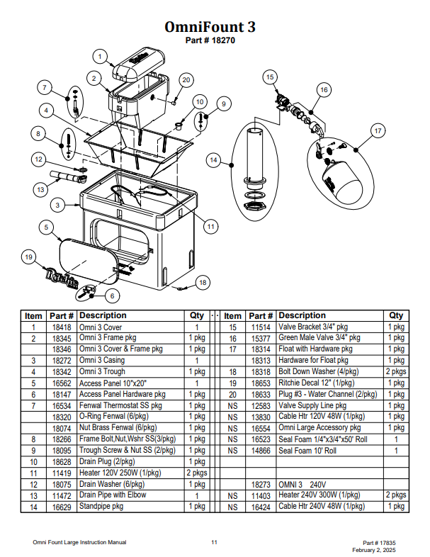 OmniFount blends technology from both of Ritchie's traditional stainless-steel units and their insulated poly units to provide the premier livestock fountain. Designed with animal safety in mind, the Omni 3 features smooth rounded edges and a fully insulated casing for energy efficiency. The stainless-steel trough features thermostatically controlled heat elements that are attached to the underside for frost free service even under the most severe winter conditions. The Omni 3 is designed for larger herds, and its fast refill valve will provide fresh water to 100 beef cattle or 50 dairy.