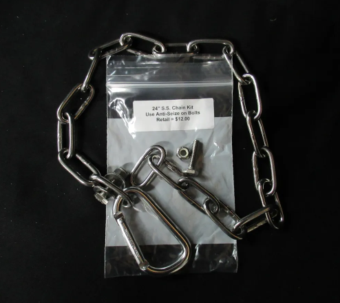 Replace your chain on either the barrel or pan floats with our chain kits. These kits are for pan floats with a 7/8 center tube and include a zinc or stainless steel 24" chain, a bolt, nut, washer and a carabiner.